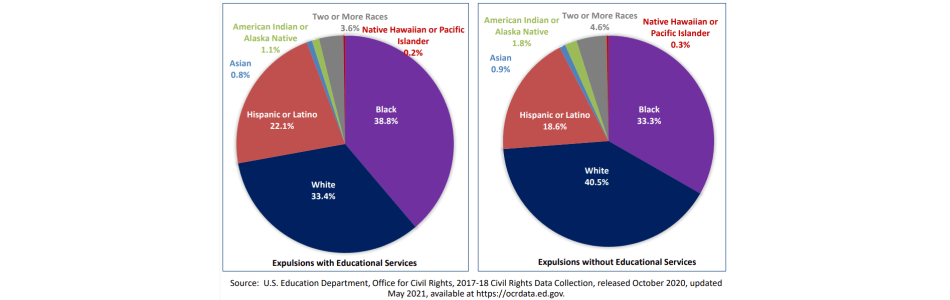 According to the CRDC (Civil Rights Data Collection), in 2017-2018, “black students, who accounted for 15.1% of total student enrollment, were expelled at rates that were more than twice their share of total student enrollment—38.8% of expulsions with educational services and 33.3% of expulsions without educational services.”