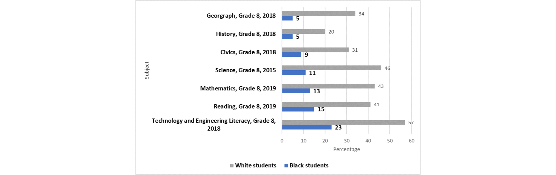 Figure 3. Percentage of 8th grade students who performed at or above the Proficient, by subjects, Black vs. white students