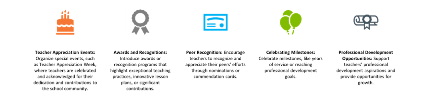 Recognizing and appreciating teacher efforts is vital for boosting morale, motivation, and overall job satisfaction. Acknowledging teachers’ hard work and achievements can contribute to a more positive and collaborative school culture. These can be achieved through:
