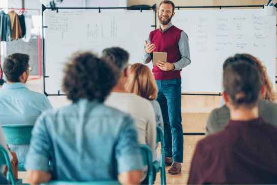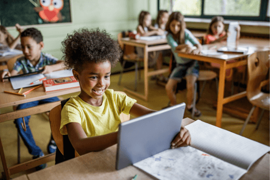A teacher holding an iPad with students raising their hands